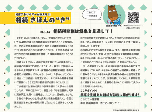 47.相続税節税は将来を見通して!(2026年1月号掲載) ※「相続きほんのき」の内容は広報誌掲載当時の法律・情報を基に作成しているため、現状と相違する場合がございます。 ※当JA管内(山梨県南アルプス市)にお住まいの方に向けた内容となっています。 ※無断転載を禁じます。