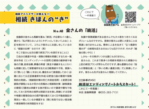 48.金さんの「終活」(2026年3月号掲載) ※「相続きほんのき」の内容は広報誌掲載当時の法律・情報を基に作成しているため、現状と相違する場合がございます。 ※当JA管内(山梨県南アルプス市)にお住まいの方に向けた内容となっています。 ※無断転載を禁じます。