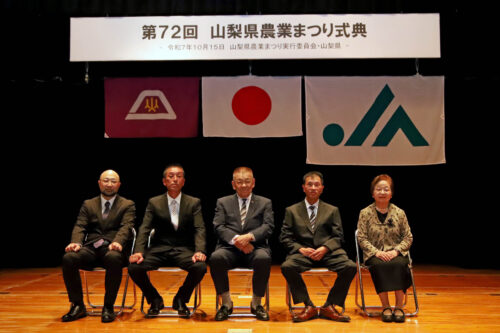 10月15日、山梨県立文学館講堂(甲府市)で開催された第72回山梨県農業まつり式典において、農水産業功績者の表彰式が行われ、当JA果実部会が果樹部門の功績者として表彰されました。