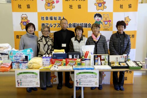 南アルプス市社協に食品など寄付(25.12.17) 2025.12.24 寄付の品と女性部員、社協の塩澤一夫会長(左から3人目) JA南アルプス市女性部は12月17日、南アルプス市社会福祉協議会に米や乾麺、調味料などの食品や、タオル、洗剤などの日用品を寄付しました。 女性部は部員やJA員、近隣住民から家庭にある食品などを集め、同社協やフードバンク山梨に寄付するフードドライブ活動に取り組んでいます。 今回は飯野・在家塚・源支部で集めた品物を、女性部員の代表が同社協に届けました。