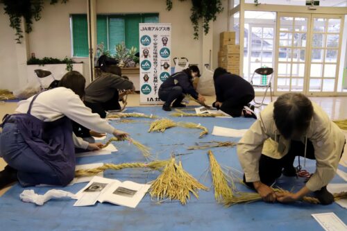 JA職員2名が材料を用意し、しめ縄の編み方や飾りつけを指導、正月に玄関に飾るしめ飾りが出来上がりました。